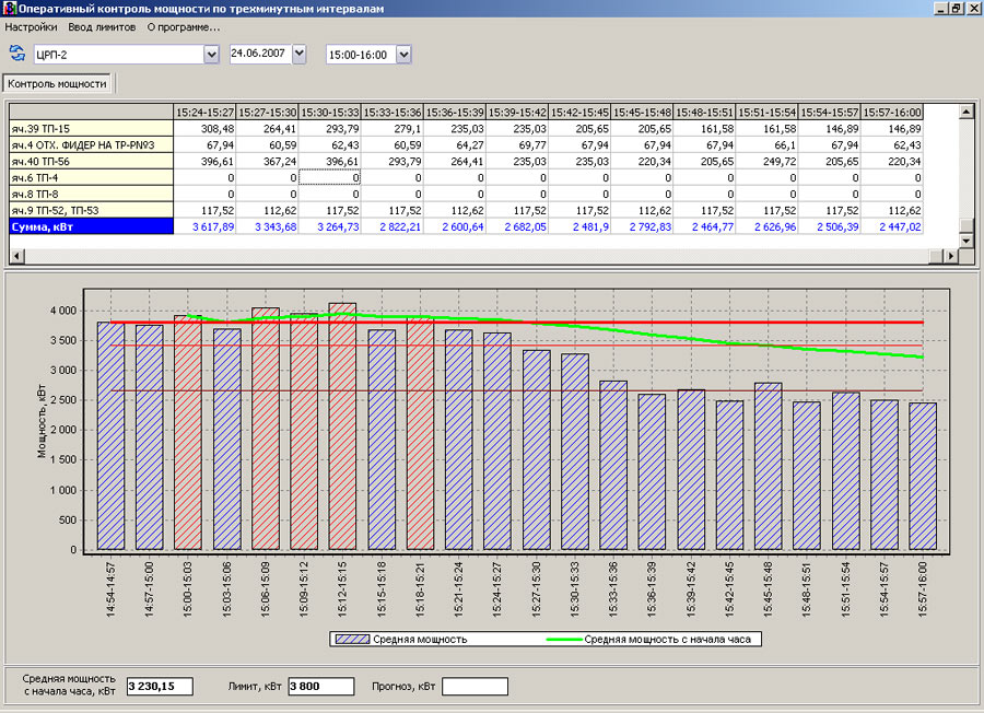 Модуль позволяет отображать потребление (выработку, передачу) электроэнергии по трехминутным интервалам по фидерам и по группам в табличном и графическом видах. Модуль выдает прогноз потребления на конец часа, содержит средства звуковой сигнализации.